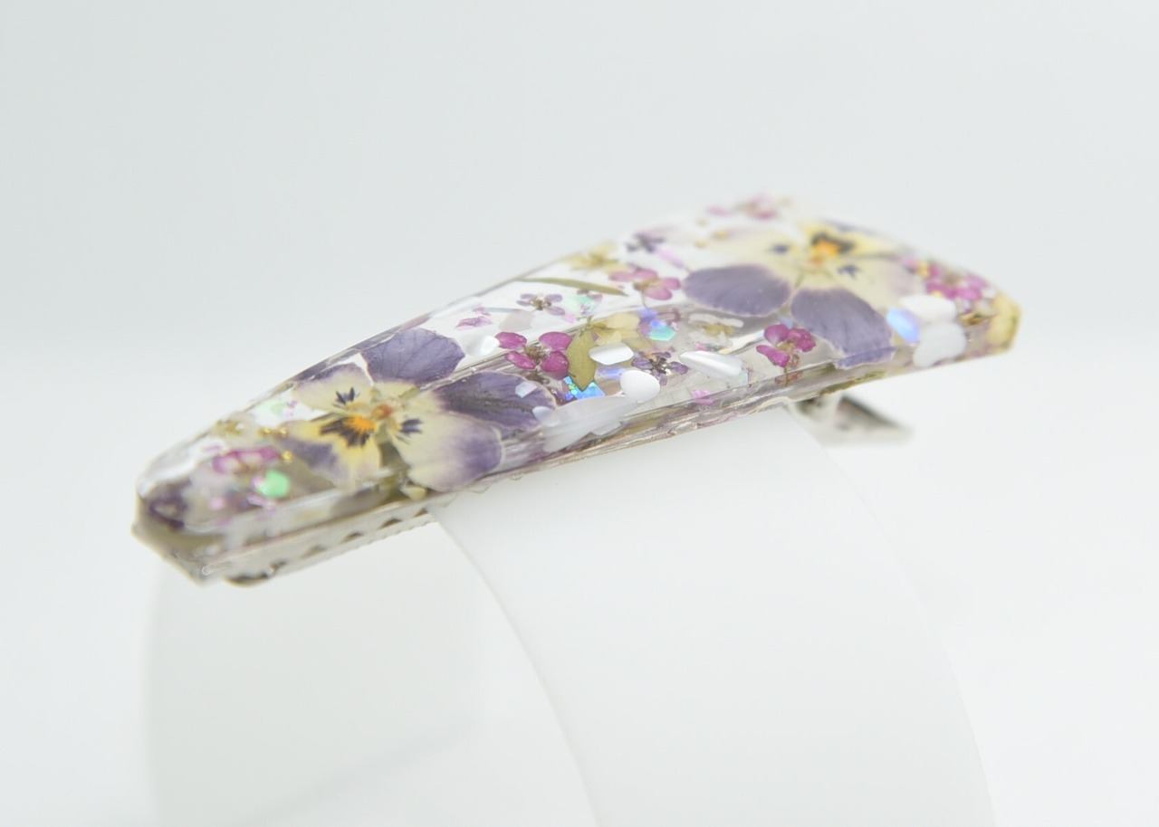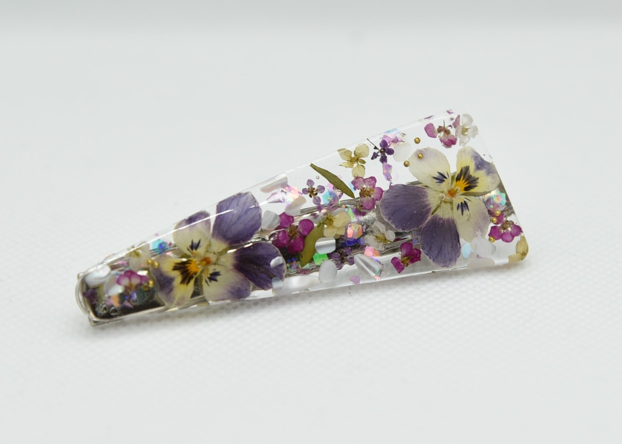 しっかりと主張がありながら、シルバーカラーのベースヘアピンとクリアカラーのレジンがスッキリとした透明感を持たせていてとても綺麗です。