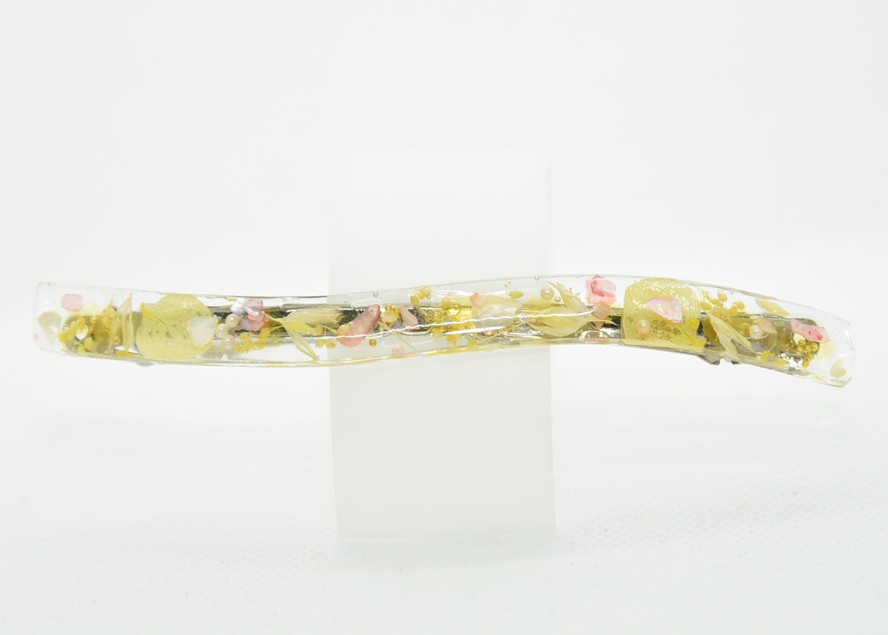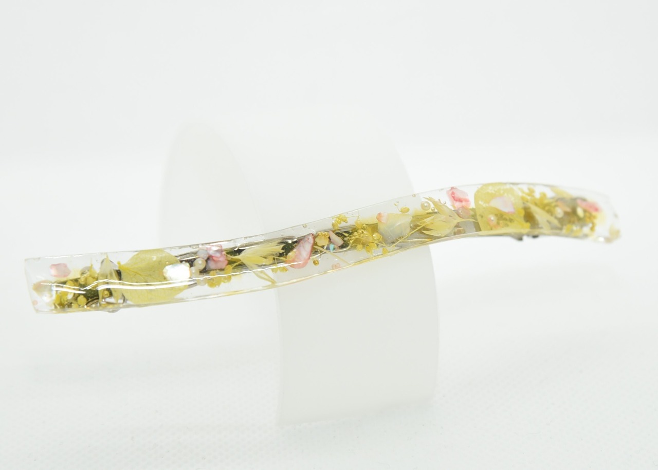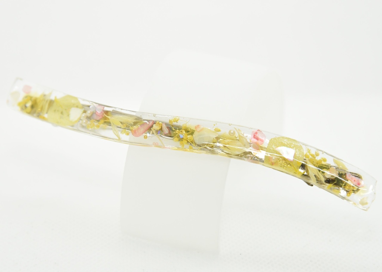 元気さと可愛らしさを感じる黄色系の色使いが魅力的なロングサイズのヘアピンです。